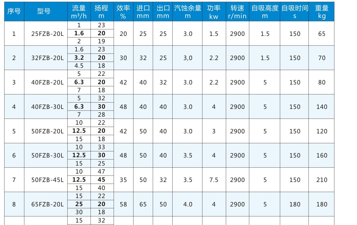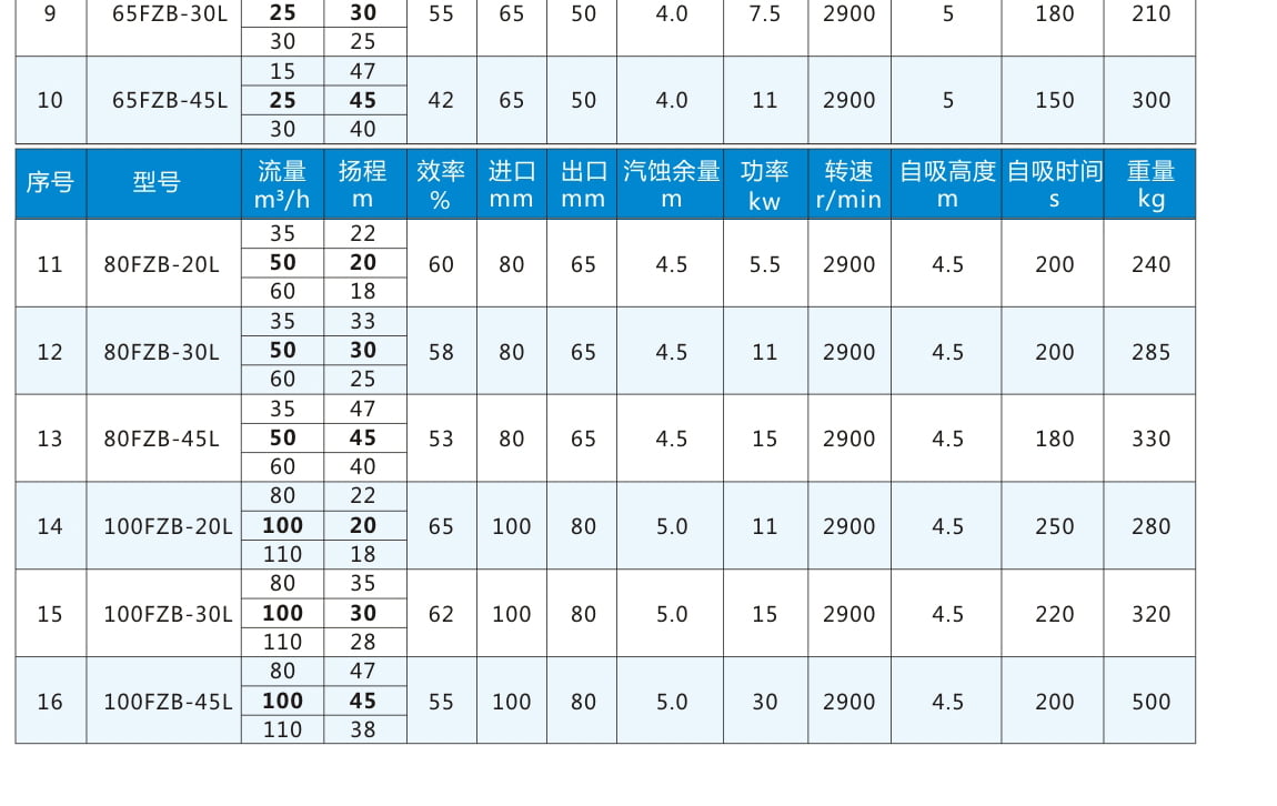 FZB:氟塑料合金自吸泵代號丨 80:進口直徑80mm 丨30:揚程30米 丨L:長支架標(biāo)準型