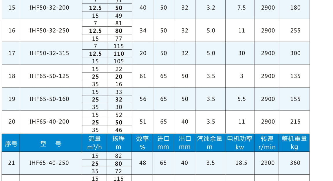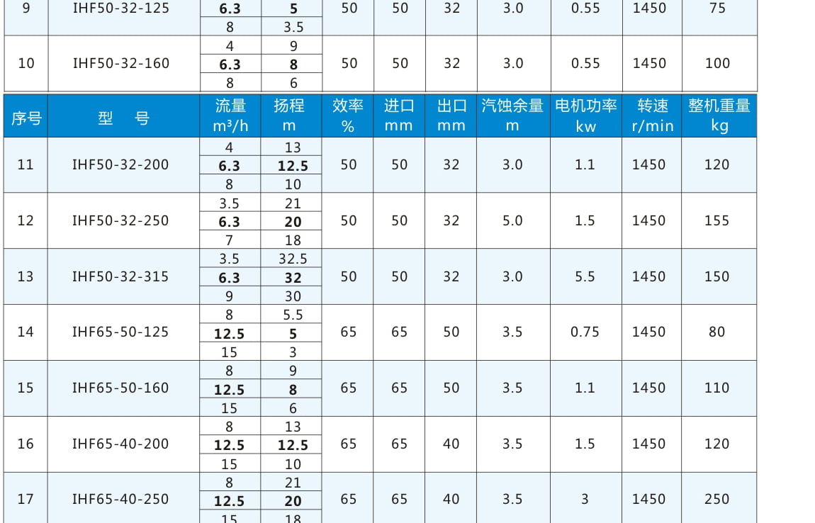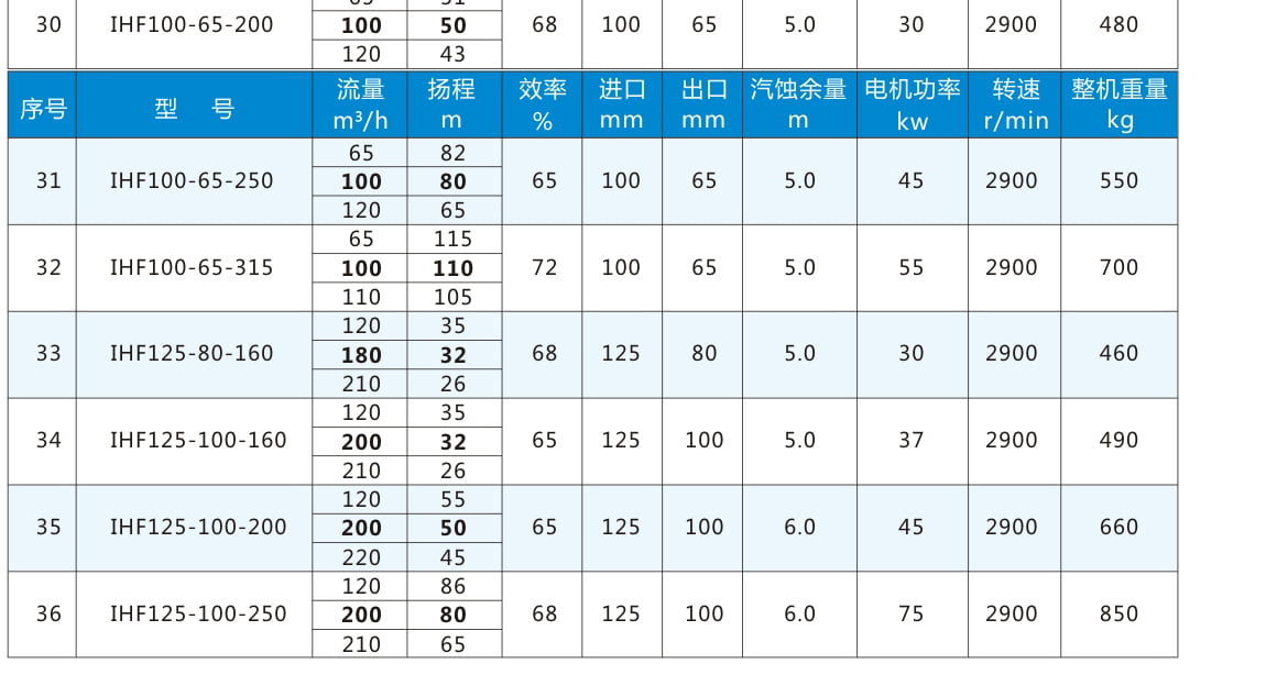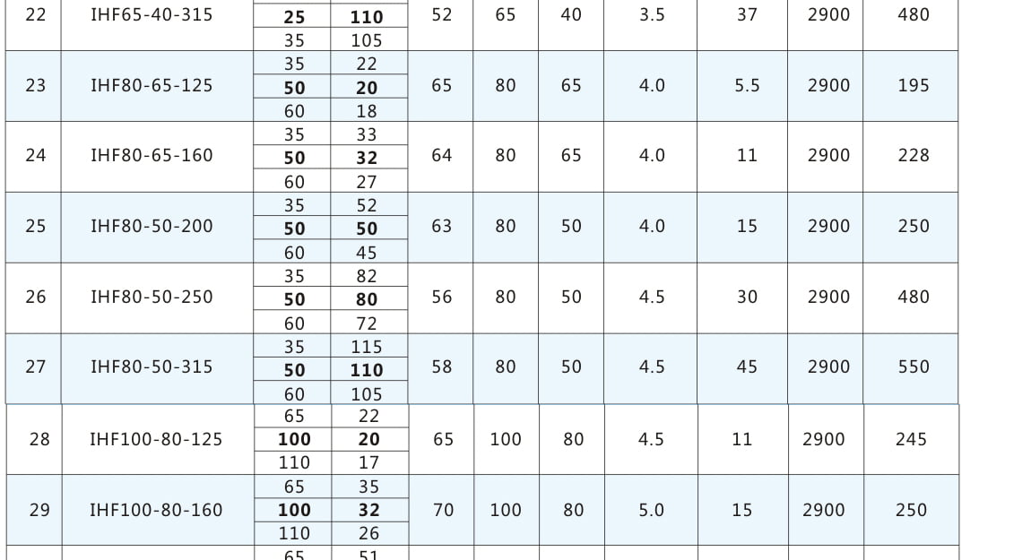IHF:氟塑料合金離心泵代號(hào)丨 80:進(jìn)口直徑80mm 丨65:出口直徑65mm 丨160:葉輪名義直徑160mm