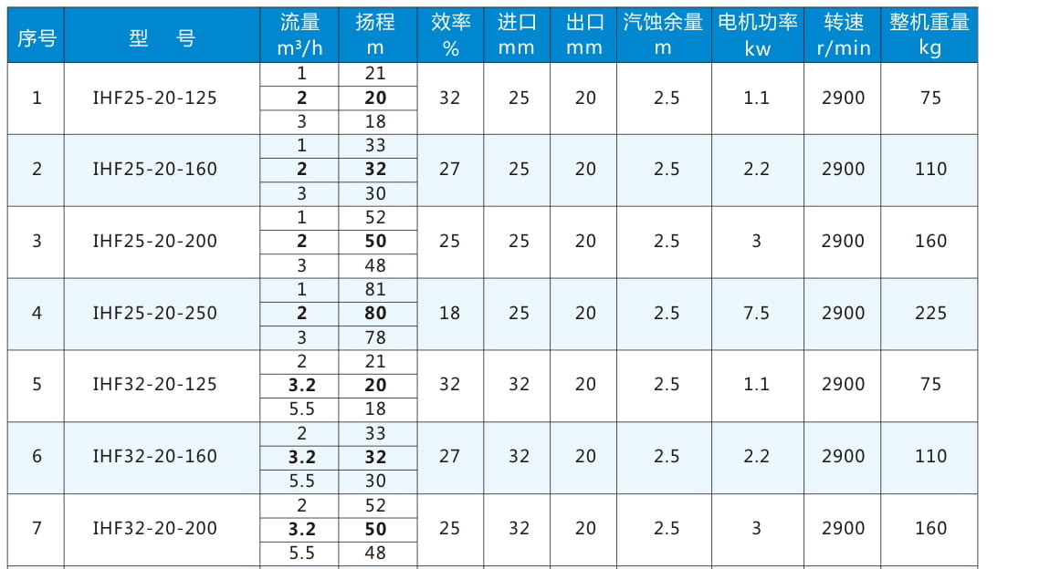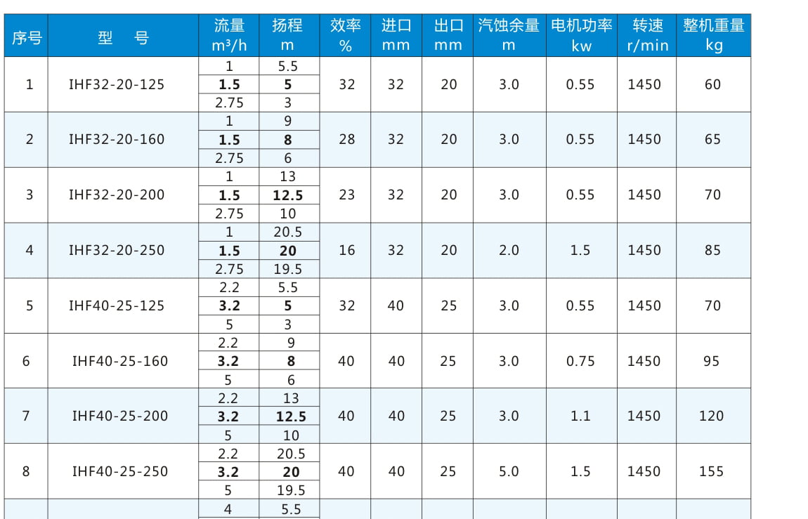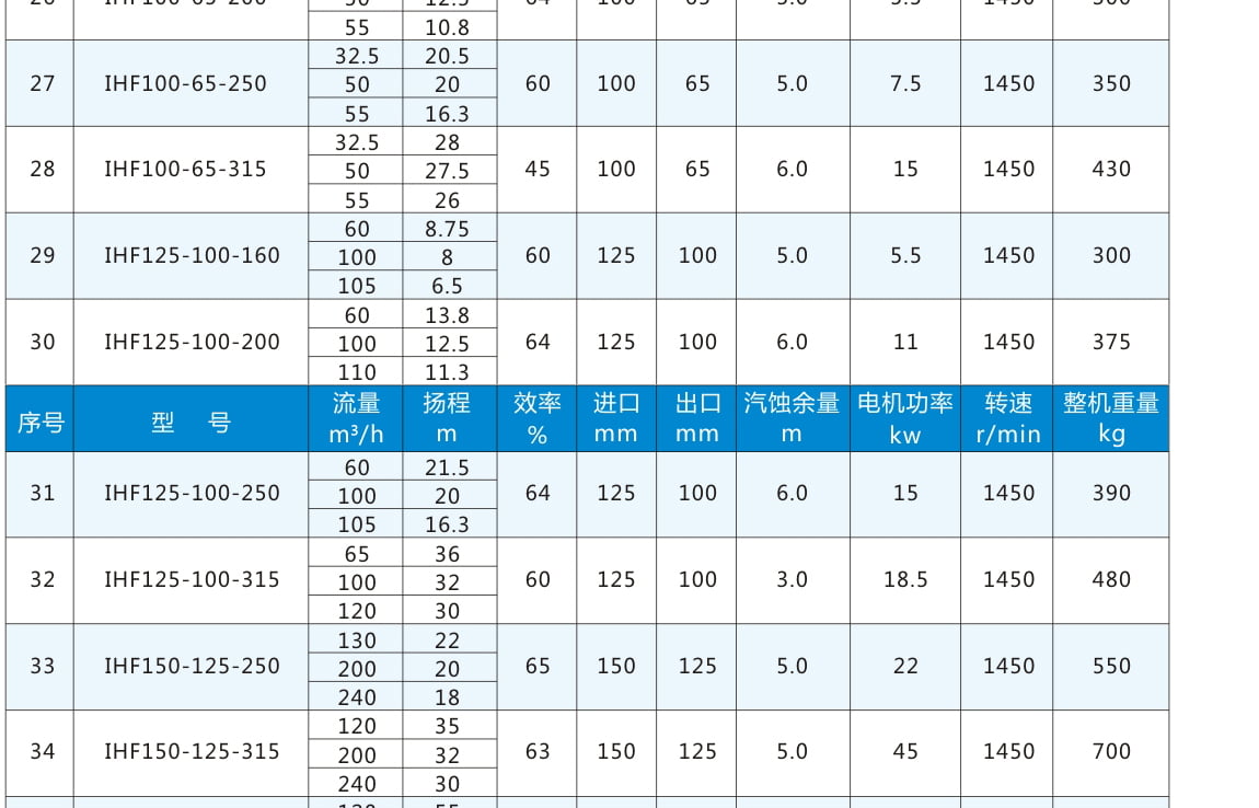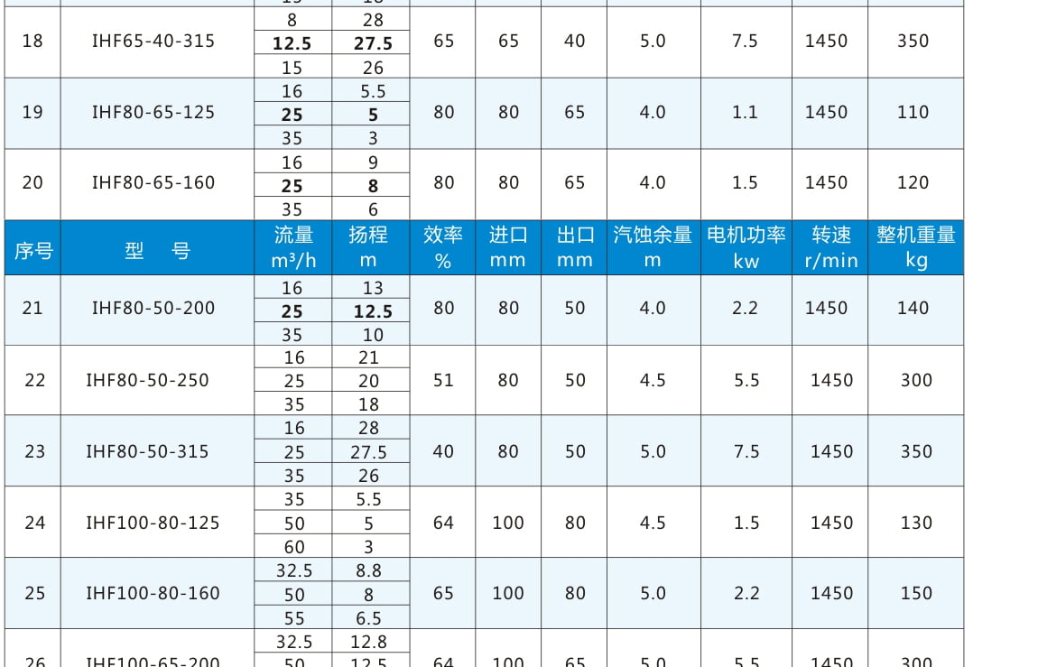 IHF:氟塑料合金離心泵代號(hào)丨 80:進(jìn)口直徑80mm 丨65:出口直徑65mm 丨160:葉輪名義直徑160mm