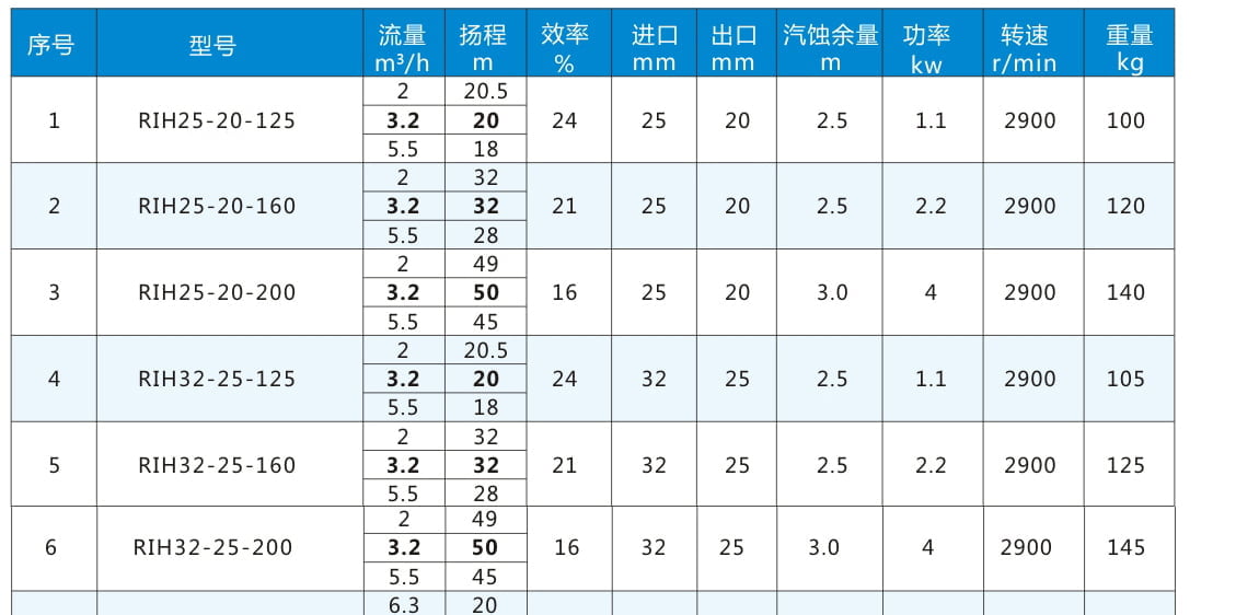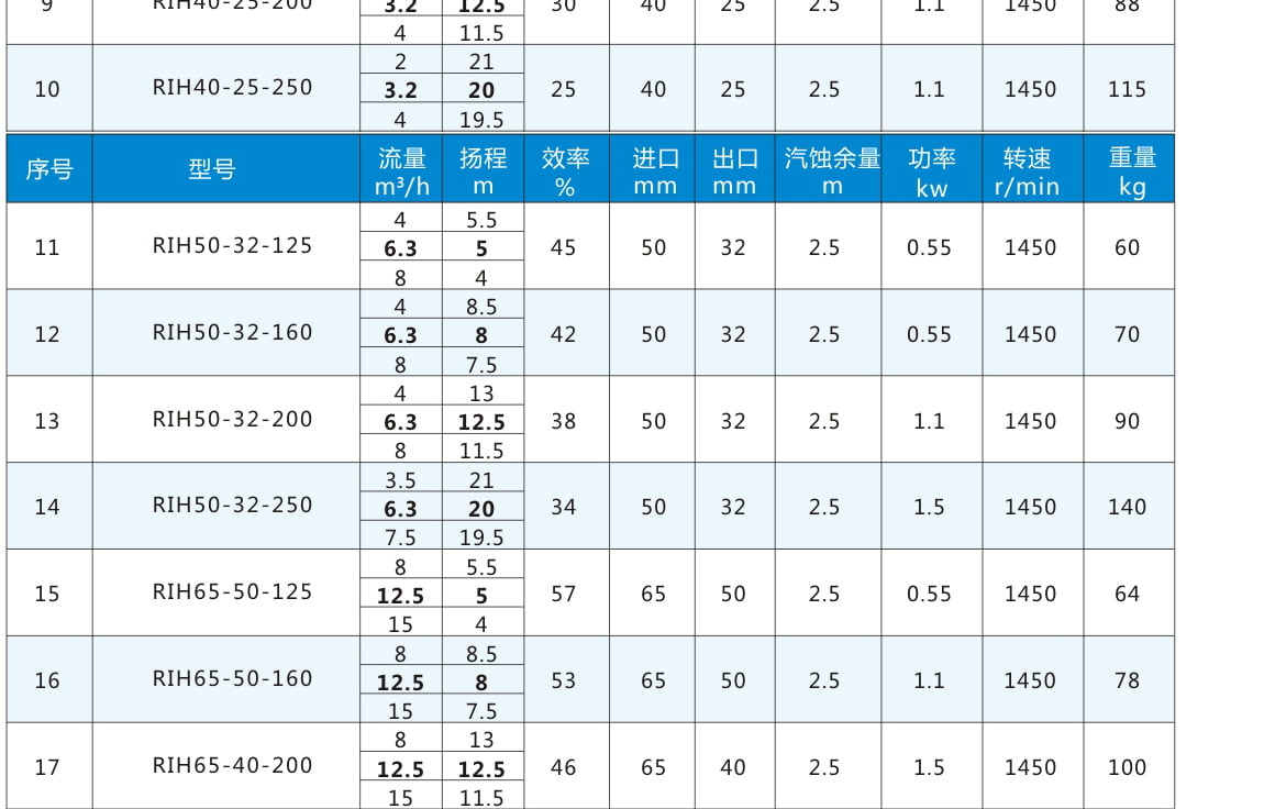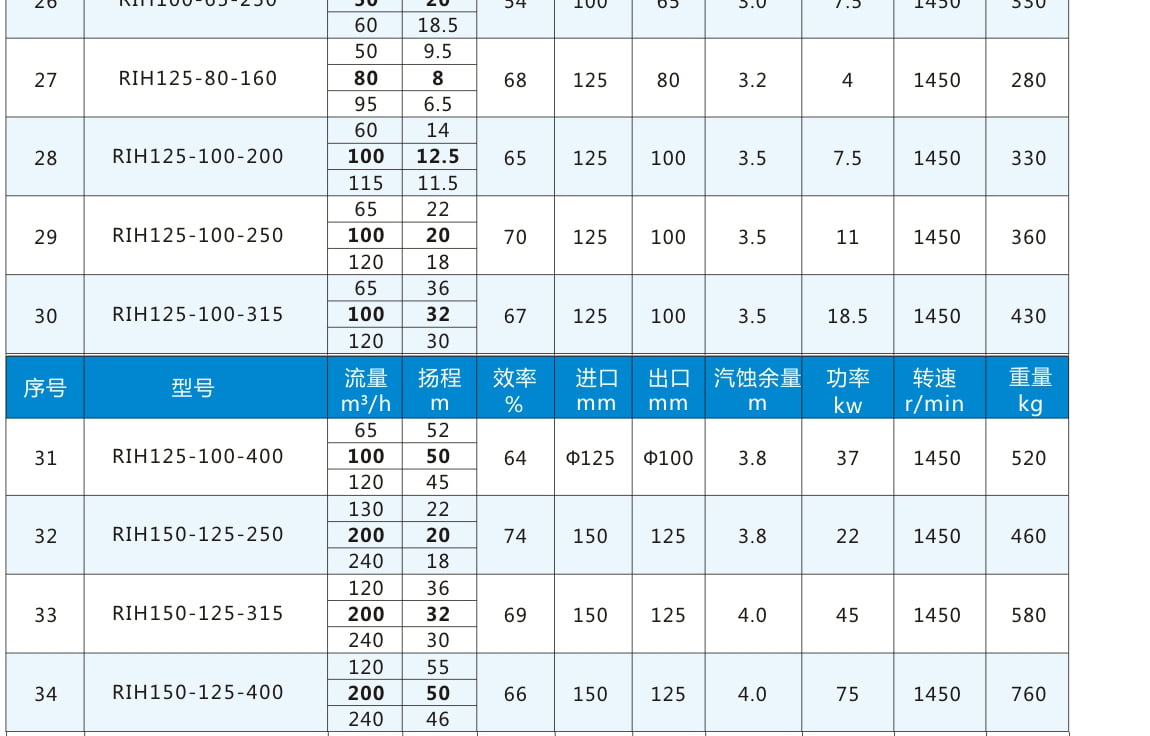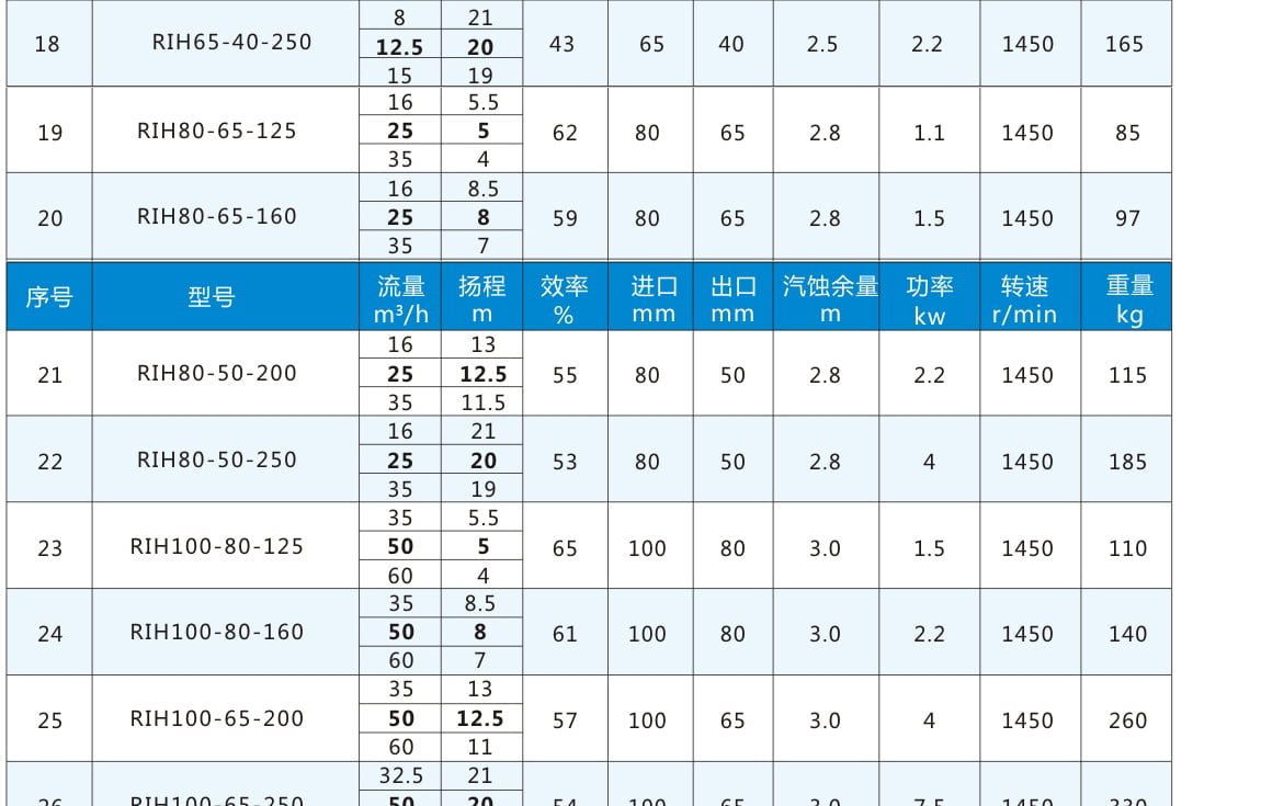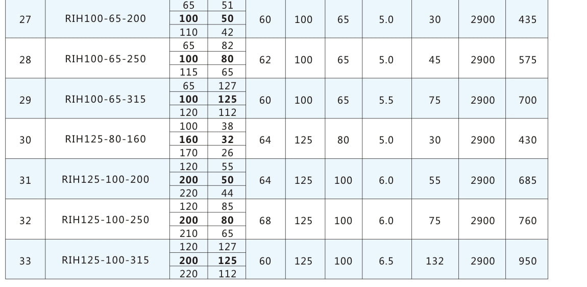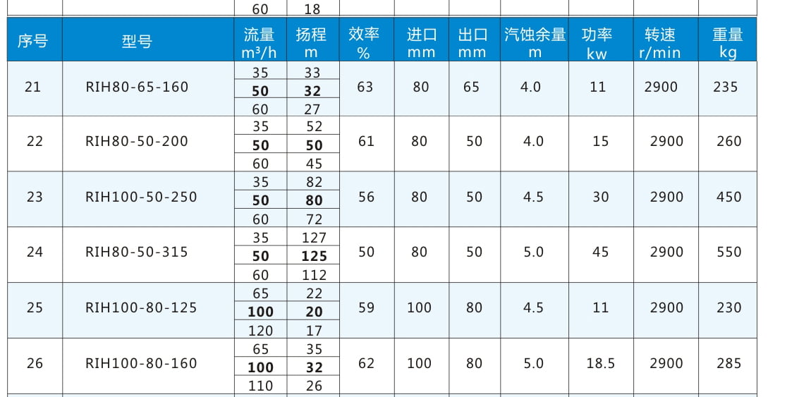 RIH:不銹鋼離心泵代號(hào)丨 80:進(jìn)口直徑80mm 丨65:出口直徑65mm 丨160:葉輪名義直徑160mm