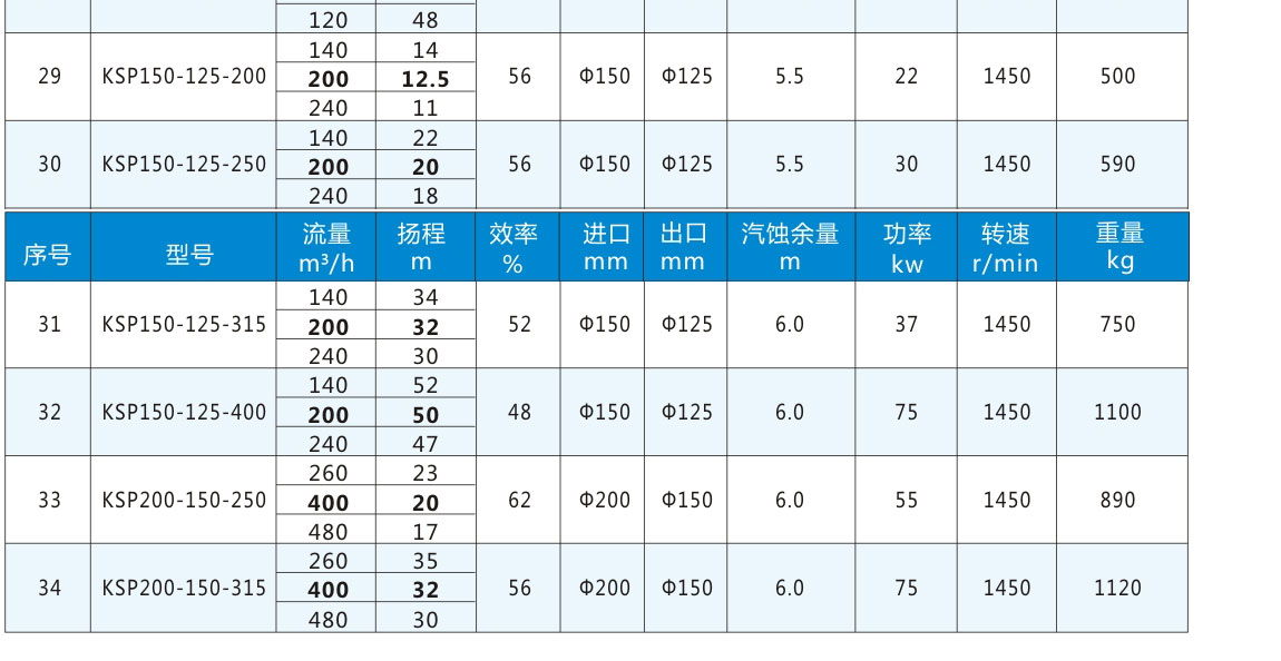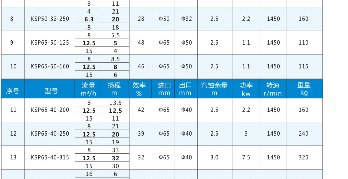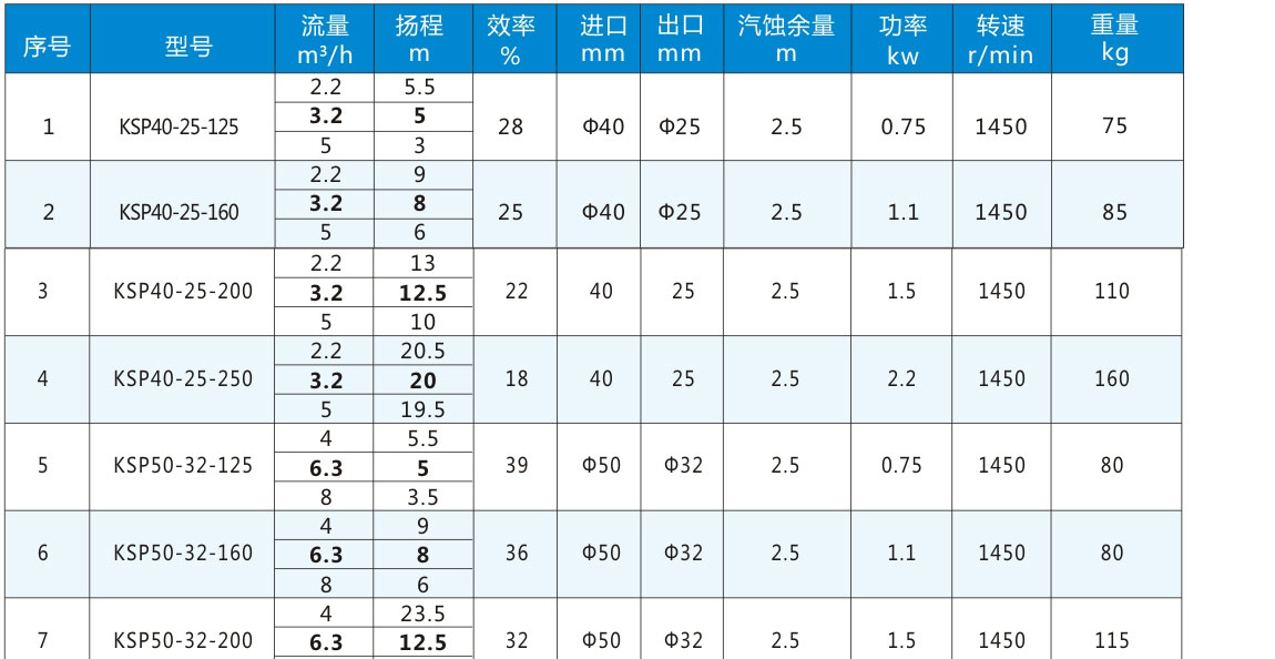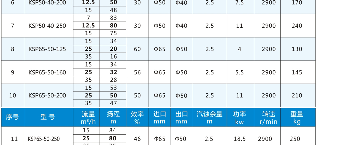 性能參數(shù)表(1):電機轉(zhuǎn)速2900r/min,表中流量揚程加粗為額定參數(shù):